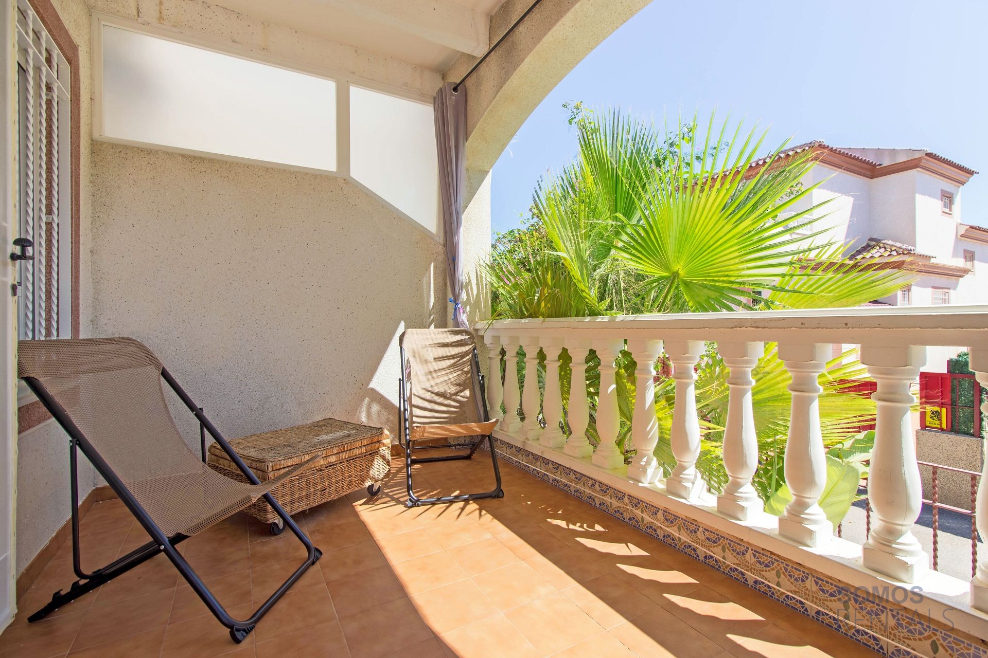 The stairwell leads to the first floor where you have access to a solarium terrace with two recling chairs and a parasol. The master bedroom is also located on this floor with a double bed, Smart TV, built-in wardrobes, en-suite bathroom with a tub and shower above, and a balcony.