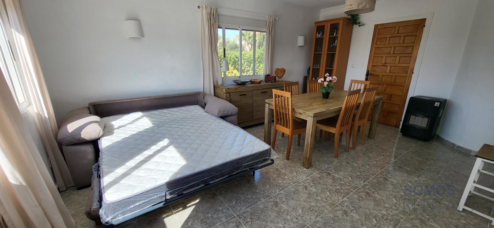 From the kitchen you can enter the large dining room/4th bedroom overlooking the pool. The quality sofa bed has a fully sprung 18cm deep mattress for up to two guests. There is also a large wood dining table and oak chairs, with a sideboard with lots of plates and serving dishes for you to use.  There is also a shelving unit which has plenty of glasses for you to use.  The dining room also has an air con unit.